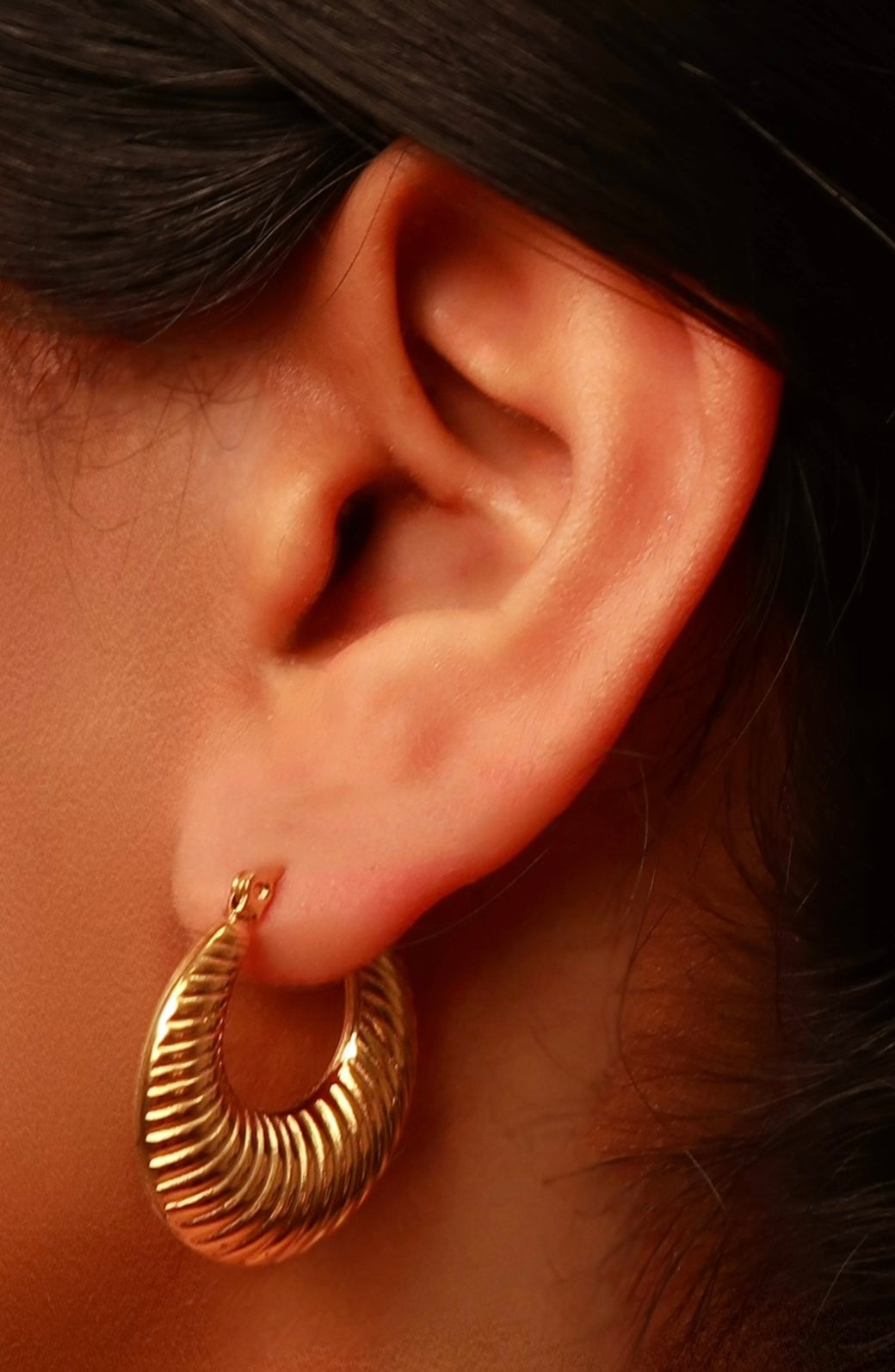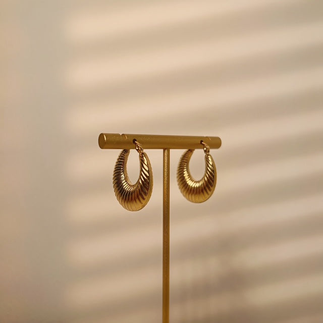 Textured gold hoops with a ridged, curved design